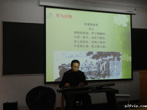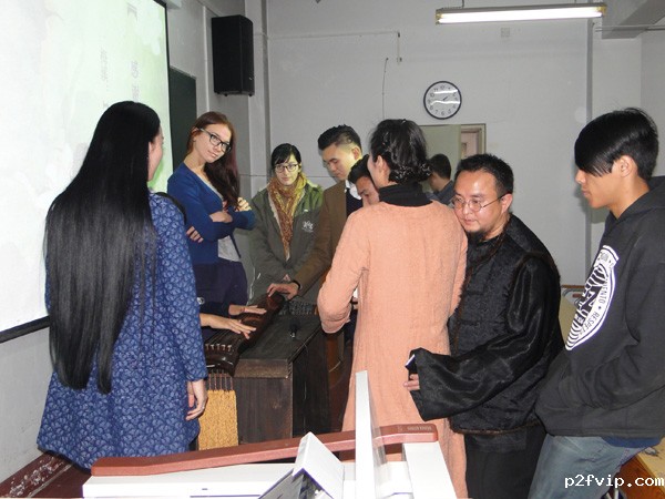 讲座结束后梅溪老师为留学生弹奏了一些古琴名曲,同学们都听得津津有味,很多同学上前去请教老师并且亲自试着弹奏。